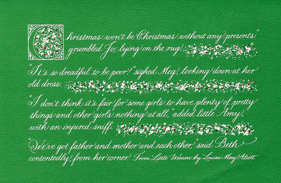 It’s December, and I’m again displaying a beloved Christmas card my younger sister sent me back in 1986. It features the opening lines from Louisa May Alcott’s classic Little Women: